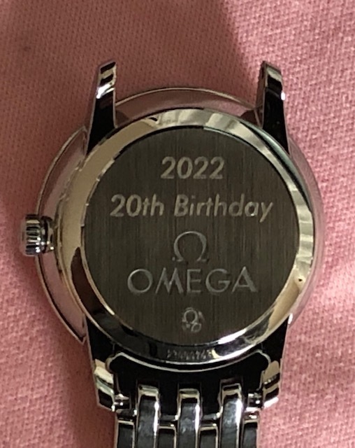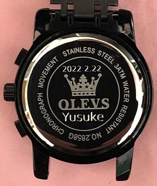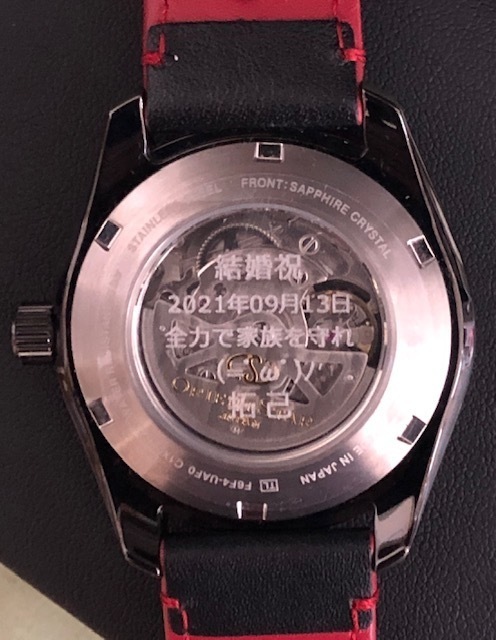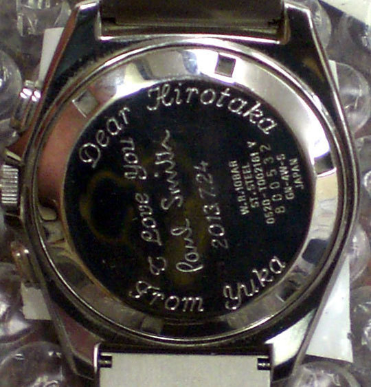 ・金属溶剤を塗布し レーザー照射により焼付けいたします。直接本体に触れる事のないレーザー彫刻ですので 時計への影響は一切ありませんし余計なキズがつくこともありません。