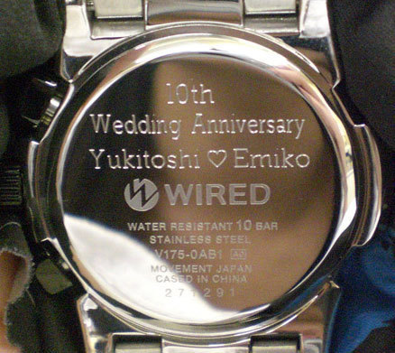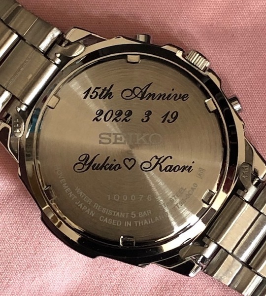 腕時計の仕様や説明書に ケース 「ステンレス」 と表記があれば レーザーによる焼付け刻印が可能です。その場合は 小さな文字でも 筆記体、ハートマークなども使用することが可能で、あなたのこだわりを充分表現できます。